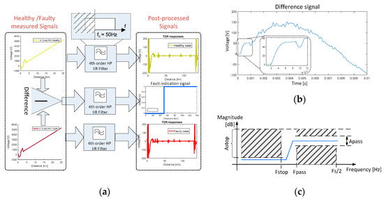 In the second part of the post-processing procedure, the measured signal and the stored reference signal (baseline) are used to compute the related TDR traces, which are carrying the information about the voltage reflections of, respectively, the impedance changes and the healthy line signature (transpositions only). Herein, they are referred to as “TDR responses”. The computation involves the use of a proper digital filtering technique to isolate the information of interest. Furthermore, the calculated difference signal is in turn also manipulated using digital filtering to give rise to the already mentioned “fault-indicator” signal, which is referred to as the “difference TDR response”. A representative scheme of the idea underlying this second part of the algorithm is reported as an example in Figure 8a.