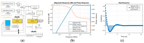 Data post-processing procedure implementation: (a) MATLAB/Simulink block scheme, (b) high-pass filter frequency response, and (c) impulse response.