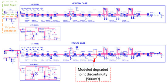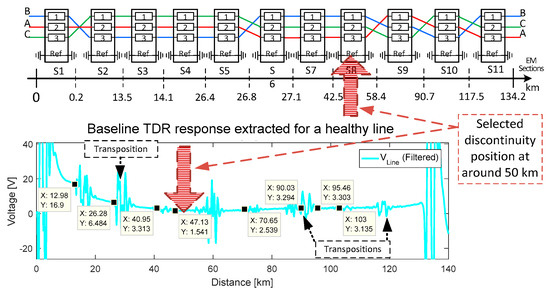 Finally, when analyzing the simulation case of a line with degraded joints, the proposed scheme must be customized by introducing a proper impedance change, which in our case was only a pure resistance with a value equal to 500 mΩ since it represents a value of anomaly one order of magnitude below the minimum value that was possible to discriminate during the real measurement campaign discussed in [21], where proper artificial lumped impedances were placed along the line. In the actual study, the anomaly was placed at around 50 km from the injection point since this represents a location where the baseline TDR response was sufficiently clear from other changes represented by the inherent line conductors’ transpositions, as highlighted from Figure 11.