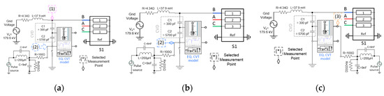 At this point, the CVT was simulated through the definition of specific values of the capacitors, C1 and C2, to match the real capacitances that can be found for a CVT suitable for the specific line under study, which has a 220 kV voltage level. In addition to this, the block indicated as “EQ. CVT model” was implemented using the same equivalent circuit representation detailed and discussed in Section 3.1, maintaining equal values of the lumped elements listed in Table 3 (i.e., setting the Trial#2 circuit). In Figure 10, three nodes (namely “1”,”2”, and “3”) are indicated to implement the three different injection/detection scenarios of interest in this paper.