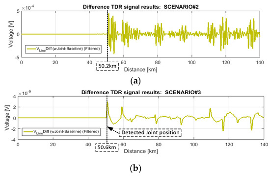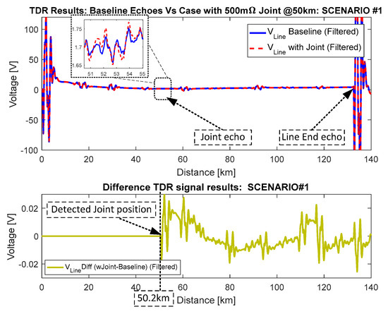 Finally, the results from the three simulated scenarios are concisely reported. First, the case where the proposed TDR technique was implemented using the connection scheme of Scenario#1 is reported for an in-service line with an artificially placed lumped impedance of 500 mΩ inserted at 50 km. As a partial final outcome of this study, either the extracted TDR responses or the extracted fault-indicator one (i.e., difference TDR signal) are reported in Figure 14. As can be seen from this, the calculated difference TDR signal is zero until the impedance change position (around the 50th km) is reached, at which the signal itself experiences a maximum peak followed by a decreasing trend.