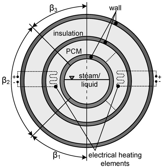 The pressure vessel of an RSS is a cylinder with elliptical or hemispherical sides [12]. The hybrid storage concept presented in this paper proposes the installation of the LHTES at the cylindrical shell surface only. Therefore, the hybrid storage is modeled as a cylinder, and the end surfaces and volumes are neglected. The heat loss at the end surfaces is assumed to be small compared to the heat transfer at the shell surface. Therefore, the end surfaces of the pressure vessel are regarded as adiabatic. A schematic representation of the hybrid storage model is shown in Figure 1. The LHTES chamber sizes are defined by an angle vector . Each chamber can have a different size, where a symmetrical structure related to the vertical axis of symmetry is assumed. This means that the design on both, the left and the right half of the circular cross-section, are equal (Figure 1). The hybrid storage model was created in Dymola 2015 FD01 [24] with the TIL 3.3-library and TILMedia 3.3-library [25] and consists of the following sub-models: