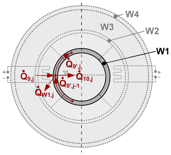 In the wall sub-model, the heat flows in the peripheral direction between the adjacent wall elements are also taken into account. Assuming an isotropic material, the corresponding thermal resistance is calculated with Equation (5).