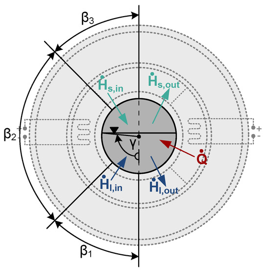 As already mentioned, it is possible to store energy from additional sources, for example, electrical heating elements inside the LHTES. Therefore, an additional heat source for each LHTES chamber is placed at the inner diameter of the LHTES sub-model to avoid the appearance of a second phase interface. This leads to the following Equation (12) for calculating the energy flow at the inner diameter of the LHTES chamber.