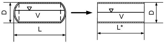 As mentioned in Section 2, the RSS is approximated as a cylinder. The real storage vessels were cylinders with dished end faces. Therefore, the diameters of the modeled vessel were assumed to be equal to the diameters of the real storage vessels. For an equal liquid/steam volume, a new length was calculated. This is schematically shown in Figure 7. In Table 1, the used geometric data are shown. For the two 80 m3 storage vessels, the geometric data are assumed to be equal. For the thickness of the outer panel, 1 mm was assumed.