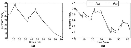 The simulations were done with the 4th order fixed-step Runge–Kutta ODE solver, with a step size of 0.01 and a tolerance of 10−6. The operational measurement data are given for every five seconds, but the sampling times for the different measurement values are different, resulting in a stepped pressure curve. In Figure 10a, the simulation result of the pressure inside the storage vessels is compared to the operational measurement data for example 1. Assuming that the first value of a step corresponds to the real measurement data, the deviation is calculated only for these values. These values are marked with x in Figure 10. The maximum error for the pressure inside the vessels was 6.43%. The pressure inside the vessel can sometimes become higher than the pressure of the charging steam during the simulation, because the measured pressure of the charging steam is used to determine the specific enthalpy of the charging and the charging mass flow is given.