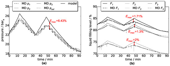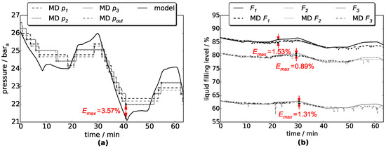 Example 1; MD denotes the operational measurement data; 1, 2 and 3 denote the different storage vessels. (a) Pressure inside the storage vessels; the model denotes the simulation results; out denotes the pressure inside the collecting pipe connected to the discharging pipes of the three storage vessels. (b) Liquid filling level inside the storage vessels.