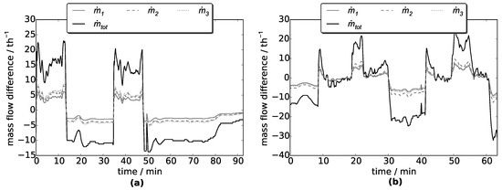 In example 2, the lowest mass flow difference occurs also in the first storage. This can be seen in Figure 12b. Nevertheless, in this example, the mass flow difference of the third vessel is lower than that for the second vessel most of the time, because of the lower liquid filling level of the third storage vessel.