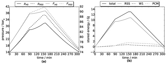 The mass calculated from pressure and filling height with the assumed geometry does not exactly equal the mass calculated from the mass flow measurement data. This deviation occurs, for example, due to measurement errors, leakages and incoming as well as outgoing liquid water mass flows. This must be taken into account when evaluating the presented results. However, the simulation results show a good accordance to the operational measurement data. Therefore, the RSS sub-model describes the behavior of a real Ruths steam storage quite well. For that reason, it can be assumed that this part of the hybrid storage model works well to analyze the behavior of the hybrid storage concept.