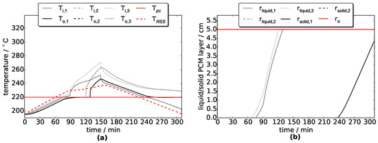 Under the assumptions made above, the LHTES sub-model (Section 2.2) can be used to solve the problem, which can also be solved with this analytic solution. Therefore, the LHTES sub-model was connected to a wall sub-model at the inner diameter. The temperature at the outer diameter of the LHTES was set to the phase change temperature, thus no heat transfer occurs at the outer diameter. For the heat transfer coefficient between the heat sink and the wall, 700 W·m−2·K−1 was chosen and the temperature of the heat sink was set to 144 °C. The wall had an inner diameter of 2 m and a thickness of 2.5 cm. The cylinder length was set to 10 m and the thermal conductivity of the wall was set to the value presented in Table 2. For the specific heat capacity of the wall, a very small value of J·kg−1·K−1 was chosen to minimize the impact of the wall heat capacity. Two different simulations were conducted. In the first simulation (SIM 1) the heat capacity was set equal to the heat capacity of the wall, therefore the simulation result must be equal to the result calculated with the quasi-stationary approximation. In the second simulation (SIM 2) the original heat capacity was chosen, thus the impact of sensible stored energy on the solidification time can be quantified. A PCM layer thickness of 10 cm was chosen and three different PCMs were used for the comparison. The material properties of these PCMs are presented in Table 3.