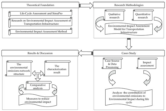 In this study, the SimaPro software (SimaPro 8.3, Institute of Environmental Sciences (CML), Leiden University, Leiden, Netherlands) was used for the data analysis. And the LCA method was used for the development EIA model to analyze the contribution of each process in the transportation project life cycle. This study employed a mixed research approach, which is depicted in Figure 1. It combined both qualitative and quantitative methods.