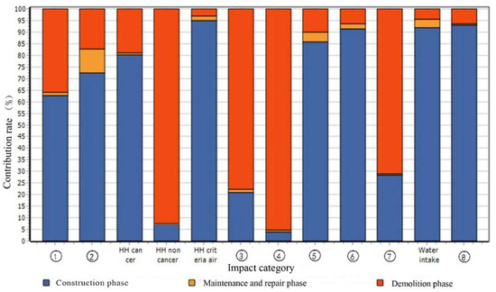 As shown in Figure 3, in the eight impact categories, the blue is dominant than other colors. It means that the environmental impact of environmental emissions in the construction phase are greater than those in other phases. Among the three colors, yellow had the smallest contribution. It indicates that the environmental emissions in the maintenance and repair phase during the fast track life cycle had the least contribution to environmental impact.