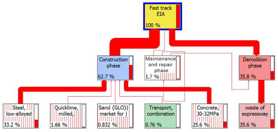 Regarding the quantitative method, the LCA was used for the EIA of fast track transportation project. To carry out the LCA, data about the background system such as production of materials, machinery, and electricity were obtained from the Ecoinvent, which is the largest environmental impact database. In the database, the production process of transportation infrastructure can be adjusted and standardized, and raw materials can be compared to the impact of the environment. The SimaPro was used for the data analysis. It is a professional software for LCA used for EIA of transportation infrastructure projects [41]. Since the development of the software in 1990, its database of materials and processes have been continuously updated, while the array of LCA cases over the years has provided more extensive data [42]. With the collected data, the emissions from the fast track transportation project can be quantified and derived, including the output of various pollutants and the emission of various greenhouse gases. This can be used to generate environmental index for various environmental impacts. In addition to generating the index, the network structure maps were used to characterize environmental loads [43]. Furthermore, input data can be clearly shown by branches of network structure maps so that the impact of energy and materials on the environment can be easily evaluated.