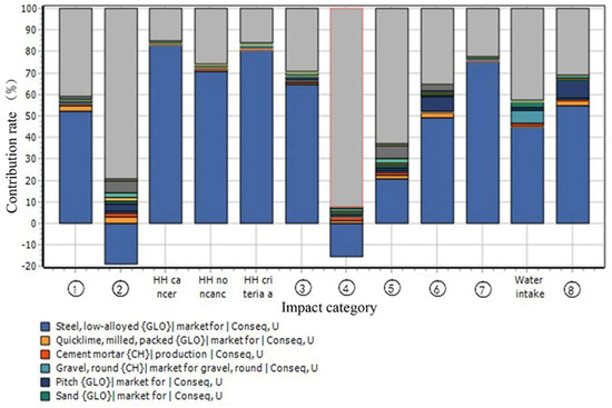 In Figure 5, gray represents concrete and blue represents steel. Obviously, gray and blue occupied the largest proportion of contributions. This means that during the construction phase, steel and concrete caused the greatest environmental emissions.