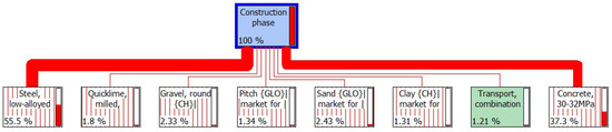 As the environmental emissions in the construction phase constituted the largest environmental impact in the fast track transportation project life cycle, further analysis (see Figure 5) was carried out to reveal the proportion of each major material identified in Table 1 that impacts the environment in the construction phase. This is useful to identify the materials that are harmful to the environment in the fast track transportation project.
