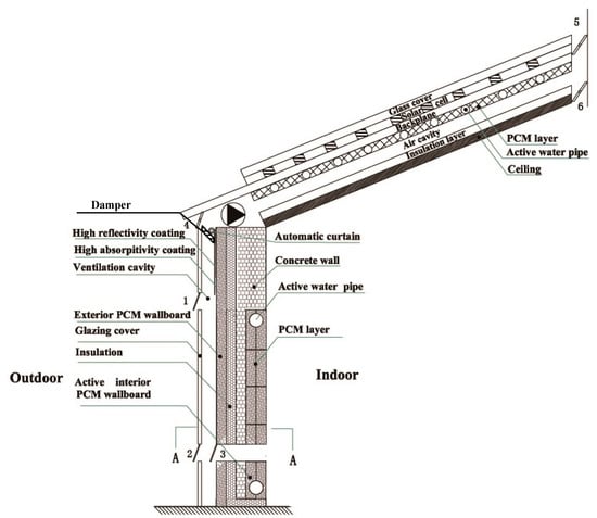 A hybrid system, which is composed of a PCM integrated ventilated Trombe wall and a PCM integrated PV/T panel, is proposed and analyzed as shown in Figure 1. There is an automatic air damper between the Vents 1 and 4. The automatic air damper is off during the summer daytime to avoid the hot air flowing into the PV air cavity, whereas the automatic air damper is on to form an air flow path during the night time. In the PV/T−PCM system, the photovoltaic/thermal panel is constituted of glass cover, solar cell, backplane, PCM layer with cooling water pipes, air cavity and insulation layer. The active cooling water is regarded as the working fluid to extract heat from the solar cell to provide hot water for the domestic usage. As mentioned in the above literature review [20,21], thermal and photovoltaic performances of the PV/T system are highly dependent on the mass flow rate of the cooling water, the temperature of cooling water, the diameter of the active cooling water pipes and the thickness of PCM layer. These parameters are quantitatively investigated in this study. Meanwhile, to avoid the moisture condensation of the PCMs−VTW radiant cooling system, active cooling water is supplied with a relatively high temperature of 20 °C, which is higher than traditional chilled water in AHU cooling coil (7 °C) or space cooling (15 °C). The availability of PCM contributes to shifting cooling energy from the off−peak period to the peak period for the domestic usage.