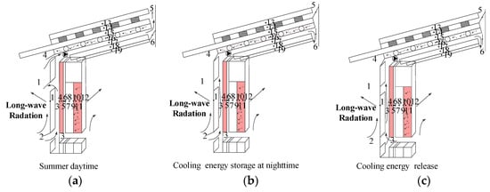 Figure 2 presents the computational nodes and heat transfer of three typical operational modes: 1) day time operation in summer; 2) natural energy storage at nighttime; 3) stored natural energy release. For the day time operation in summer as shown in Figure 2a, air vents 1, 2, 4, 5 are open. The automatic curtain coated with high reflectivity coating descends to reflect solar radiation in the daytime. The cavity air is heated by the solar radiation and is exhausted from vent 1 via natural ventilation. The ventilation fan is activated to cool the PV module with mechanical ventilation. For the natural energy storage at nighttime as shown in Figure 2b, the automatic curtain ascends to reflect solar radiation in the daytime. Air Vents 2 and 6 are open and the low temperature outdoor air enters the air channel from outside, solidifies the exterior PCM and the PCM in the PV/T system and is blown indoor by fans (mechanical ventilation). For cooling energy release as shown in Figure 2c, air Vents 3 and 6 are open and the indoor air enters the air channel, melts both exterior PCM and PCM in the PV/T system and is blown into room by fans (mechanical ventilation).