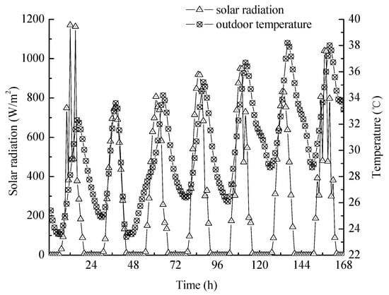 As for meteorological parameters in Changsha, a typical summer week (from 1 August to 7 August) from Chinese Standard Weather Data (CSWD) as shown in Figure 3, is selected. As shown in Figure 3, the average air temperature and the solar radiation were 30 °C and 255.5 W/m2, respectively.