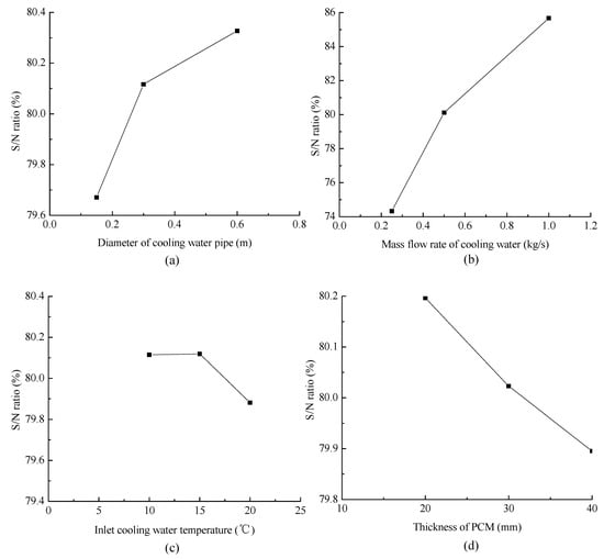 This research is to identify the optimal combination and corresponding values in energy-related variables such as the diameter of active cooling water pipe, the mass flow rate and the inlet temperature of active cooling water and the thickness of PCM. The−higher−the−better S/N ratio is adopted for the analysis as shown in the Equation (50).