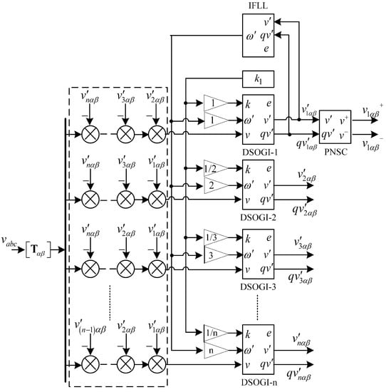 The DSOGI-IFLL can perfectly reject the high-order harmonics due to its second-order filtering characteristics. However, the detection error will not be acceptable when the low-order grid voltage harmonics, such as the third and fifth harmonics, are relatively large. To address this issue, a cross-feedback network, proposed in [24], consisting of multiple DSOGIs, like the one shown in Figure 2, tuned at different frequencies, is presented as an effective solution to accurately detect the information of the fundamental sequence, even under the extremely distorted grid voltage. From now on, this new system will be referred as multiple DSOGI-IFLL (MDSOGI-IFLL). The main building block of the MDSOGI-IFLL consisted of n DSOGIs is shown in Figure 5.