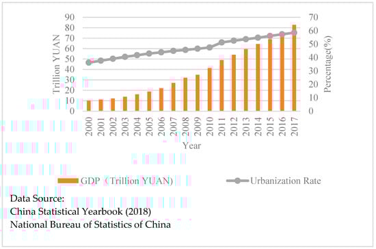 Gross Domestic Production (GDP) and urbanization rate from 2000 to 2017.