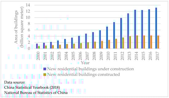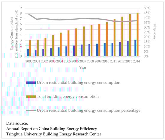 China’s unprecedented socio-economic development and fast urbanization (see Figure 1) has driven great expansion of residential buildings. As indicated in Figure 1, the urbanization rate has been increasing steadily and rapidly from 36.22% in 2000 to 58.52% in 2017. The total Gross Domestic Production increased by approximately 7 times from 10.02 trillion Yuan in 2000 to 82.71 trillion Yuan in 2017. In accordance with the fast development of Gross Domestic Production (GDP) and urbanization rate, the area of residential buildings also increased dramatically. According to the data from the Nation Bureau of Statistics of China [], the area of new residential buildings under construction per year has been increasing by 17% per year on average, compared to the year 2000 level, and reached 12.50 billion square meters in 2014 (see Figure 2). The area of new residential buildings under construction and constructed, after 2014, are leveling out around 12.5 billion square meters and 4.2 square meters, respectively. Along with the gradual improvement of living quality, fast increase of building area, and rapid urbanization, the energy consumption of residential buildings has also been increasing dramatically [,]. According to the data from Tsinghua University Building Energy Research Center, as indicated in Figure 3, building energy consumption has increased by more than two times and reached 814 million tons of standard coal in 2014 whilst it was only 300 million tons of standard coal in 2000. During the same period, energy consumed by residential building rose to 301 million tons of standard coal in 2014 from 131 million tons of standard coal in 2000 []. In 2015, energy consumed by residential buildings accounted for 19.10% of total energy consumption (see Figure 4) []. Excluding urban centralized heating in Northern China, the energy consumption in residential buildings increased to 199 million tons of standard coal in 2015, which is approximately three times the amount in 2001. Currently, the energy consumption of residential buildings is still growing rapidly. The World Bank predicts that the Chinese urbanization rate will be 70% by 2030 []. Experience from developed countries shows that the building industry will account for 30% of annual global CO2 emissions and 40% of total energy consumption in 2030 [].