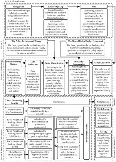 The complete structure and corresponding logic flow of this article is illustrated in Figure 5. The remainder of this paper is organized as follows. Section 2 introduces the novelty of this paper and the theoretical foundation for hierarchy construction, which are based on the nested policy design framework and the policy environment theory. Section 3 presents the detailed process of factor collection, classification, and evaluation. Section 4 summarizes the results of the data processing; discusses the weights and ranking of each criteria, sub-criteria, and factors to provide additional details on how the progress of the EE promotion in new residential buildings is affected; discusses the expectations regarding the situation in the long term; and discusses the achievements and limitations of this study. Section 5 presents the conclusions and corresponding policy implications. By investigating frontline stakeholders, this paper depicts a panoramic and authentic picture of how the nationwide EE promotion of new residential buildings is affected and stimulated. The result helps eliminate the perception disaccord between researchers, policymakers, and frontline stakeholders, and further help them better understand the current situation and the transformation of the EE promotion of new residential buildings from stakeholders’ perspectives.