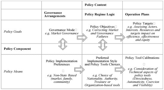 The nested policy design framework, proposed by Howlett [], is a level-based policymaking approach concerning governance arrangement, policy regime, and policy instrument selection (see Figure 6). Governance comprises actors from all segments of society working together to pursue collective goals []. The general category of governance arrangements is legal-based, corporatist-based, market-based, or network-based. Governance arrangement can also be understood from the political (actor constellations), polity (policy regime logic/institutional property), and policy (policy instruments) [] dimensions. Types of governance arrangements result in different preferences of policy regime logic and policy instrument selection (see Appendix Table A2).