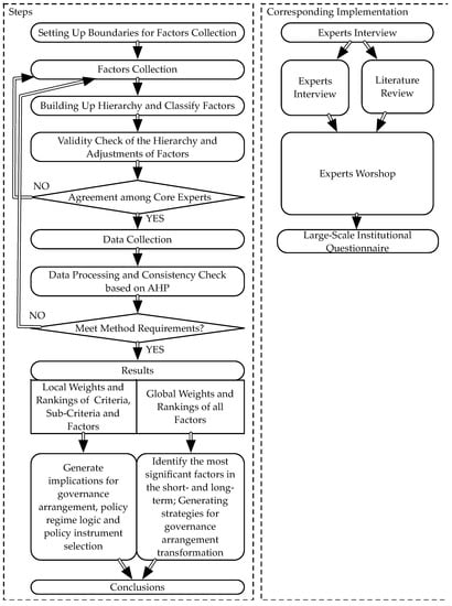 The whole methodology comprises three major parts: (1) Factor collection and hierarchy construction, (2) investigation and data collection, and (3) evaluation based on the AHP. The boundaries for factor collection are set at first. Factors were collected according to the literature from the technology and policy perspectives. The classification of the factors was based on the policy environment theory. The structure of the hierarchy was built based on the nested policy design framework. Nationwide institutes’ questionnaires were conducted to collect judgements on the influence of these factors. The target group comprised institutes from different climate zones and of different interests. Collected data was processed using the AHP approach. Corresponding conclusions and policy implications were provided based on the calculated weights and rankings. The structure of the methodology and its implementation process are detailed in Figure 7.
