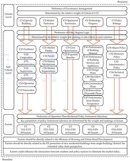 With the help of the nested policy design framework, a hierarchy of three levels were designed as follows: Level 1—criteria level-preference of governance arrangement. These criteria concentrate on only the fields and sectors (e.g., market and technology)—that is, “what type of governance arrangement does, or will China have, and what type of policy instruments should be preferred?” is analyzed or answered on this level. Level 2—sub-criteria level-preference of policy regime logic. These sub-criteria concentrate on the subsectors of the EE promotion of new residential buildings— that is, they are trying to build up the foundation for answering the question “which type of instruments should be selected or preferred?” on this level. Level 3: factor-preference of operational plans (technical policy instrument selection). These factors provide the empirical statistics and evidence of parameter configuration of policy instruments for implementation and collaboration among instruments. Figure 8 gives a detailed graphical presentation of the structure of the constructed hierarchy and its components. The correspondence between the different hierarchic levels and the nested policy design framework is also illustrated.