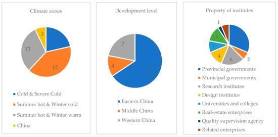 Nationwide institutional questionnaires were used to collect opinions from various frontline stakeholders. Thirty-two institutions from different types of stakeholders, climate zones, and development levels from the national perspective were asked to fill out the questionnaire. The systematic sampling method was used to select these institutes. Additionally, to further improve the stability and amplify the representation of questionnaires, additional requirements were added depending on the property of the institutes when conducting the institutional questionnaires. These requirements are as follows. For government departments, advice from same-level departments, for example, financial departments, industrialization departments, and quality supervision departments, should also be collected when accomplishing the questionnaire. For other institutions, opinions reflected in the questionnaire should be a combination of opinions from high-level decision-makers, frontline workers, and other individuals involved in the industry. The result of institution selection is in Figure 9.