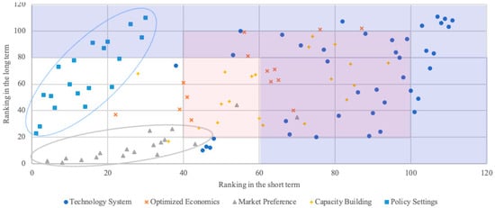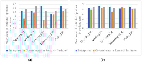 As to stakeholders’ attitudes towards the influence of each criteria, Figure 10 depicts the corresponding results. In the short term, enterprises believe that the influence of economic factors (C3) is greatest and is in line with the influence of policy settings (C5), whereas governments believe that economic factors (C3) is of the least influence. Research institutes believe that factors regarding market (C2) are of the great influence. In the long term, all the stakeholders believe that the factors regarding market (C2) are of the most significant influence. In addition, research institutes also believe that the capacity building (C1) is of the same influence as the factors in market system (C2). Enterprises hold the opinions that factors regarding economy (C3) are as influential as the factors regarding policy settings (C5). Research institutes believe the economy factors (C3) are of greater influence than policy settings (C5), while governments hold the opposite judgements.