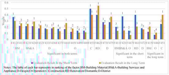 The average opinions of judgements from different stakeholders are summarized in Table 2. All the experts agree on the judgements of the influence of policy settings (C5), market optimization (C2), capacity building (C1), and technology progress (C4) in both terms. The overall opinions (M values in Table 2) indicate that policy settings (C5) have the greatest influence in the short term and the second least influence in the long term. The influence of technology progress (C4) and market optimization (C2) will slightly increase, and market optimization (C2) will result in the greatest impacts in the long term. The changes of C2 and C5 between terms indicate strategic change of the development of EE promotion of new residential buildings in China—that is, a more “marketized” policy environment should be formed. The M increase of C4 stresses the necessity of technology—no matter what type of development pattern should occur; technological progress remains the influence of the same level.