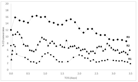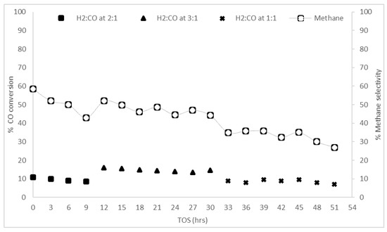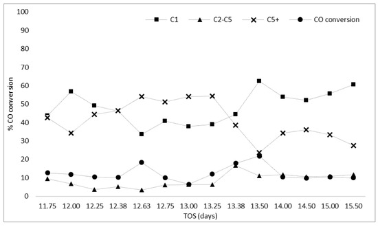 | D | The catalyst’s behavior if the feed ratio was interrupted or altered during the reaction | At day 16, after 9 h of reaction, the H2:CO feed ratio was altered from 2:1 to 3:1 for 15 h. The ratio was then changed to 1:1 until day 19. |