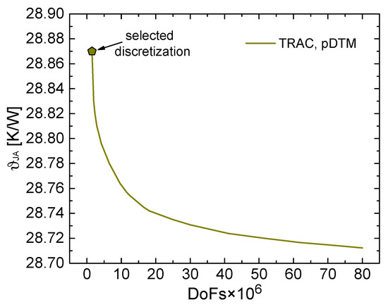 A preliminary convergence analysis of the spatial mesh discretization of the constructed pDTMs was performed for chosen packages; more specifically, the calculated thermal metrics were monitored by increasing the DoFs until a negligible mesh sensitivity was observed. Then the discretization leading to only <0.1% inaccuracy was selected not to face the computational effort required by extremely fine meshes, this choice being also justified by the higher uncertainty of the experimental data.