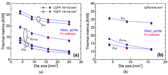 Figure 3b). The slight discrepancy between TRAC and the FV software must be attributed: (i) to the different mesh styles of the compared tools; and (ii) to the fineness degree adopted in both of them, which was not extremely high to prevent unnecessarily long CPU times. As can be seen, the thermal metrics decrease with increasing the die size (i.e., the HS size) due to the lower dissipated power density and the enhanced lateral heat spreading.
