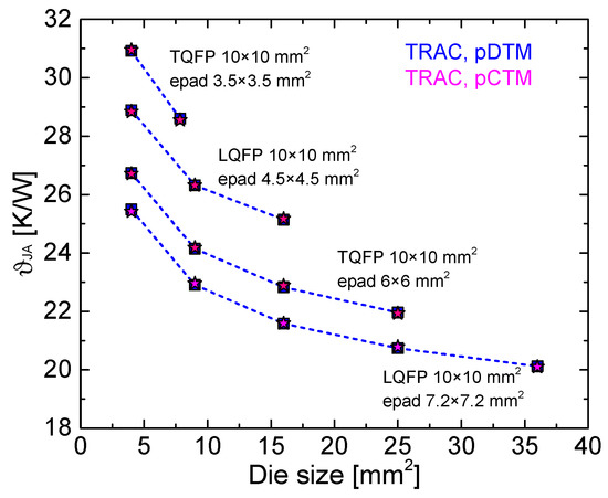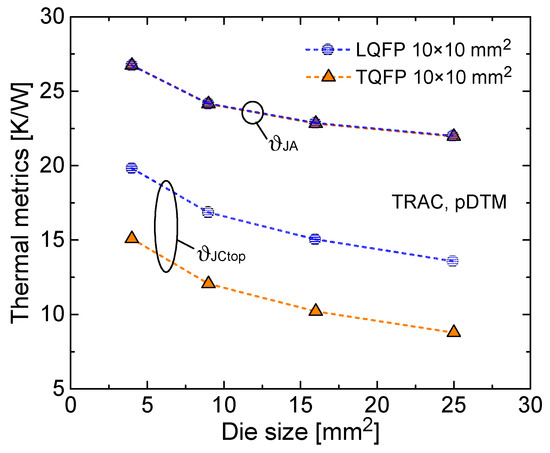 ϑJCtop (for TQFPs, a 25–35% reduction of this metric is observed with respect to LQFPs), since in this case the heat generated in the die flows toward the cold plate placed on the top crossing the whole package; a marginal influence is instead found for all other metrics (including