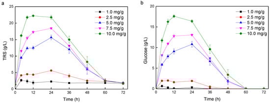 Figure 1. Total reducing sugar (TRS) (a) and glucose (b) evolution profiles of lipid production at 37 °C with various amounts of cellulase.