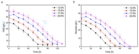 When the SSLP process was applied for lipid production, enzyme dosage affected the rate and degree of corn stover hydrolysis, and consequently, cell growth and lipid synthesis. Additionally, higher culture temperature was found beneficial to enzymatic hydrolysis and led to more lipids [23]. Hence, the experiment was done with 10.0% solid loading at 37 °C in the presence of various cellulase dosage. The evolution profiles of glucose and TRS are shown in Figure 1. It was remarkable that TRS and glucose concentrations were low during the whole process with cellulase at a low loading of 1.0 mg/g or 2.5 mg/g, and that lipid titers were only 4.3 g/L and 5.5 g/L, respectively (Table 1, entries 1 and 2), indicating that corn stover hydrolysis was limiting. When cellulase dosage reached 5.0 mg/g, glucose and TRS concentrations were 10.8 g/L and 15.7 g/L, respectively, at 24 h, suggesting that the rate of sugar release was faster than assimilation by yeast cells. After 72 h, lipid titer was 6.2 g/L (Table 1, entry 3), which was increased by 12.7% and 44.2% compared with those using cellulase dosage of 1.0 mg/g and 2.5 mg/g, respectively. Interestingly, those sugar evolution profiles also indicated that R. toruloides cells assimilated both glucose as there was little TRS left in the media (vide infra). When more cellulase was loaded, lipid titer remained at the level of 6.2 g/L (Table 1, entries 4 and 5), albeit noticeably more TRS and glucose were observed at the early stage of the culture process. This was probably due that lipid production was inhibited at 37 °C. In the previous studies, higher product titers were obtained at temperatures higher than the optima for cell growth [23,29,30]. For example, our previous study achieved the highest lipid titer at 37 °C from cellulose by Cryptococcus curvatus ATCC 20509 [23], while Zhu et al. obtained the highest ethanol yield at 34 °C from DryPB corn stover by Saccharomyces cerevisiae SyBE005 [30]. However, these studies also pointed out that higher temperatures significantly affected cell metabolism. Hence, it was important to produce lipids at the optimal growth temperature, albeit enzymatic hydrolysis rates dropped substantially [31].