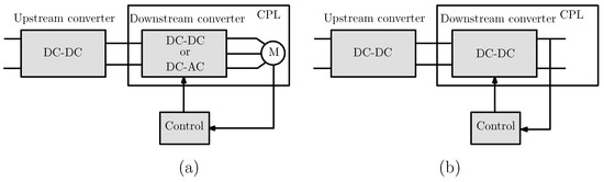 Figure 1 shows typical configurations of cascade connection of switching converter where CPL behavior may appear. CPLs exhibit a negative impedance behavior leading to a high risk of instability in this type of interconnection [1,11,12]. The control design of upstream DC-DC converters supplying constant power to the downstream converter becomes challenging due to the nonlinearity of the CPL.