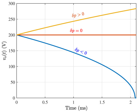 Figure 4. Response of the nonlinear electrical network of Figure 3. C = 20.8 μ F. v o [ 0 ] = v g = 200 V. The current I lim has been varied in the set { 4 , 5 , 6 } A to consider the cases δ P = 200 W < 0 ( I lim = 4 A), δ P = 0 ( I lim = 5 A) and δ P = 200 W > 0 ( I lim = 6 A). The collapse time in the case of δ P = 200 W < 0 is t c 2.1 ms in perfect agreement with (8).