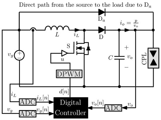 At the initial time ( n = 0 ) without the presence of the diode D a , the previous constraints have no solutions and the system may have serious problems to startup. With initial conditions i L ( 0 ) = 0 and v o [ 0 ] = v g [ 0 ] (presence of diode D a ), the previous condition becomes