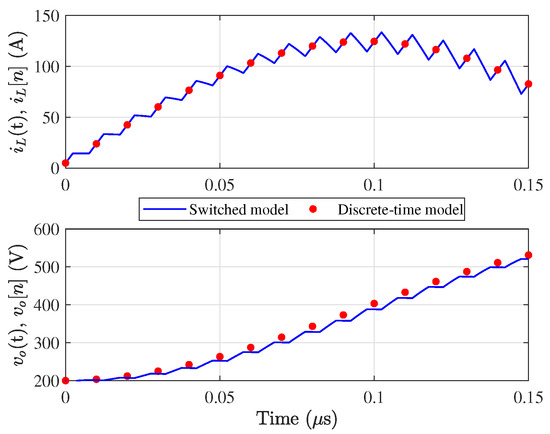 Figure 7. Comparison between the evolution of the state variables from the approximate discrete-time model and from the switched model implemented in PSIM © software. V g = 200 V, T = 10 μ s, L = 326 μ H and d [ n ] = D = 0.5 .