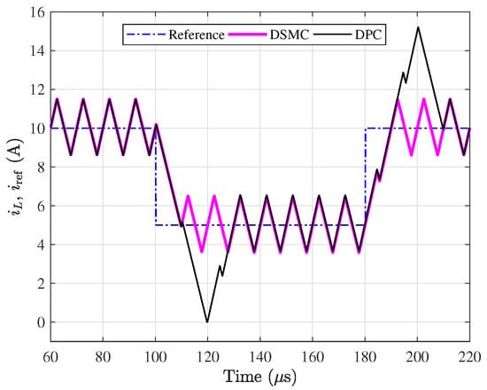 Figure 8. Comparison between the inductor current response corresponding to the predictive control and the DSMC. Under the DSMC, the inductor current reaches its reference in one switching/ sampling cycle. Under the predictive control, the inductor current reaches its reference in two switching/sampling cycles.