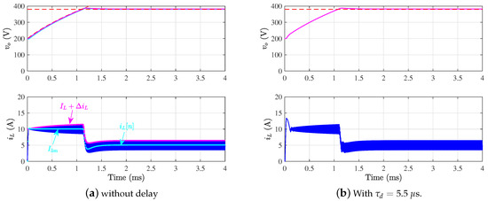 Before continuing our study on the DSMC of the boost converter loaded by a CPL, we will present a short comparison with the Digital Predictive Control (DPC) published in [42]. To make the comparison clear and easy to follow, let us consider that the current reference i ref , the output voltage v o and the input voltage reference v g are constant ( v o [ n ] = V o and v g [ n ] = V g n N ). Please note that these are the same operating conditions used in [42] when deriving the control law. The fixed-frequency DSMC will be later applied separately using the full-order model of a boost converter loaded by a CPL. When applied to the DC-DC boost converter, the duty cycle in the case of DPC is given by the following expression:
