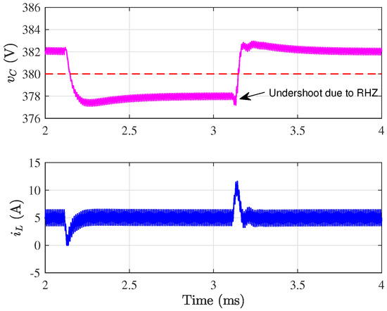 Figure 15. Small-signal transient response in front of a ± 4 V step change between 378 V and 382 V in the reference voltage from numerical simulations using a detailed switched model implemented in PSIM © and the discrete-time model showing a non-minimum phase behavior.
