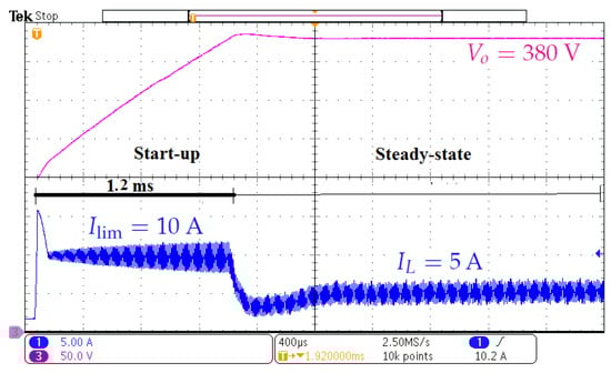 Figure 14. Startup and steady-state response from numerical simulations using a detailed switched model implemented in PSIM © when the samples of the output voltage are replaced by their steady-state value in (41) but using the instantaneous values of the output voltage in the expression of i ref given by (37).
