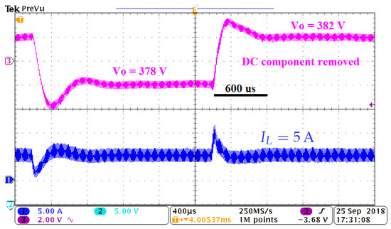 Figure 21. Response to a ± 4 V step change in the voltage reference from experimental measurements. DC component has been removed from the output voltage.