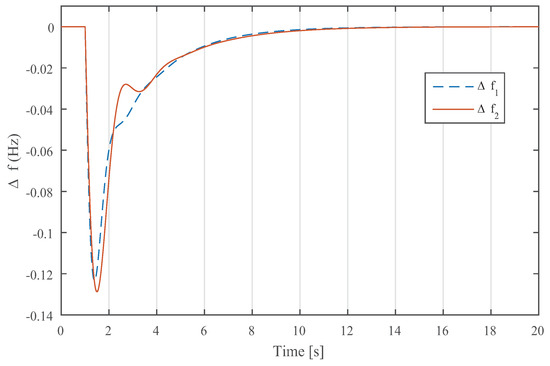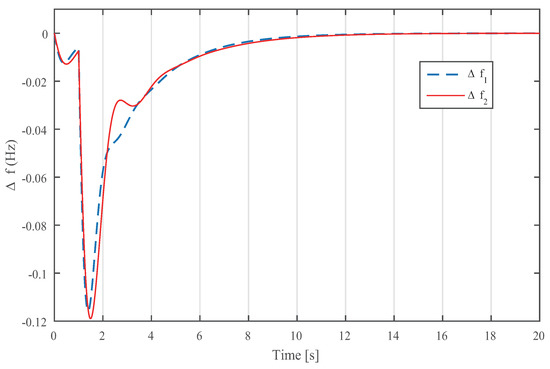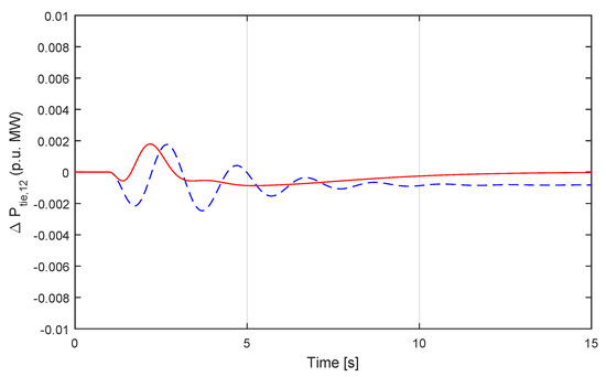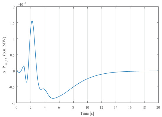 In Figure 3, Figure 4 and Figure 5, when time s, there are the load demands p.u. MW for the two areas 1 and 2, respectively. Due to the control laws (29) and (30), and approach to zero. Based on Equation (5), if Hz, there must be p.u. MW, which is shown in Figure 4. In the same time, and also approach to zero quickly. Thus, the proposed method is effective.