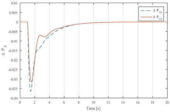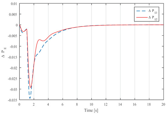 When the above V2G system subjects to SOC, though the plant gain is still designed by the expression (12), its value must satisfy the region decided by the SOC. According to Table 1 and expression (12), the plant gains and are and , respectively, which obviously belong to the region . In application, the SOC is usually limited between to keep battery life. Here, the designed values of convert plant gains and also satisfy the region . Thus, the above control laws (29) and (30) that are still useful yield the following Figure 6, Figure 7 and Figure 8. When s, there are p.u. MW for the two areas 1 and 2, respectively. It is clear that the responding curves shown in Figure 6, Figure 7 and Figure 8 prove the validity of Theorem 3.